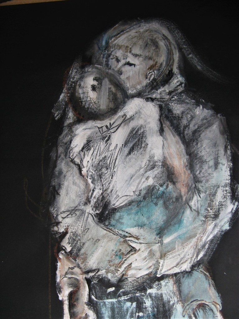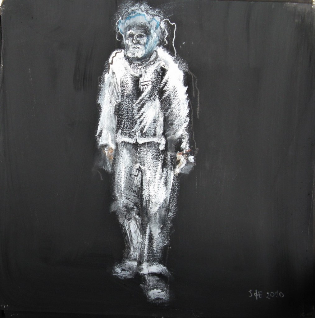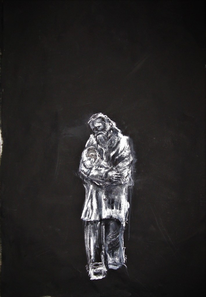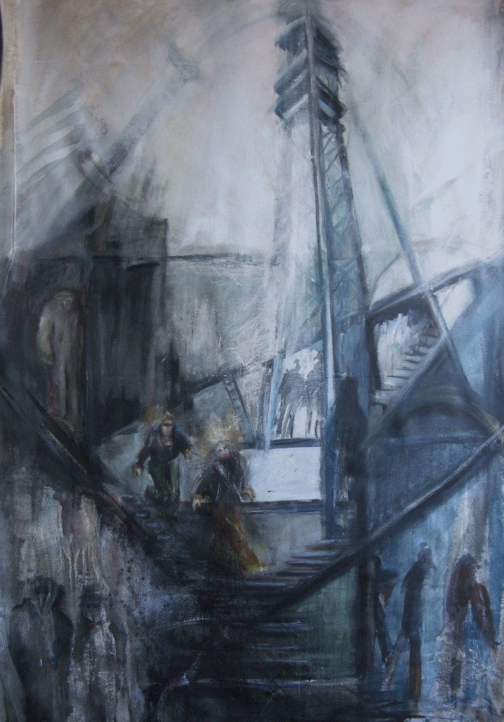 Le déclencheur de ce travail est une série d’images suscitées par la lecture de « La route « de Cormack Mc Carthy. Je vis clairement au cours de la lecture toutes ces personnes et ces lieux teintés exclusivement de gris et de noir. L écriture très simple en apparence de Cormack Mac Carthy traduit en mots sobres les situations vécues par l’homme et son enfant dans un monde dévasté, mais cette écriture simple en apparence suscita en moi des tas d’images, resurgissant épisodiquement par la suite.