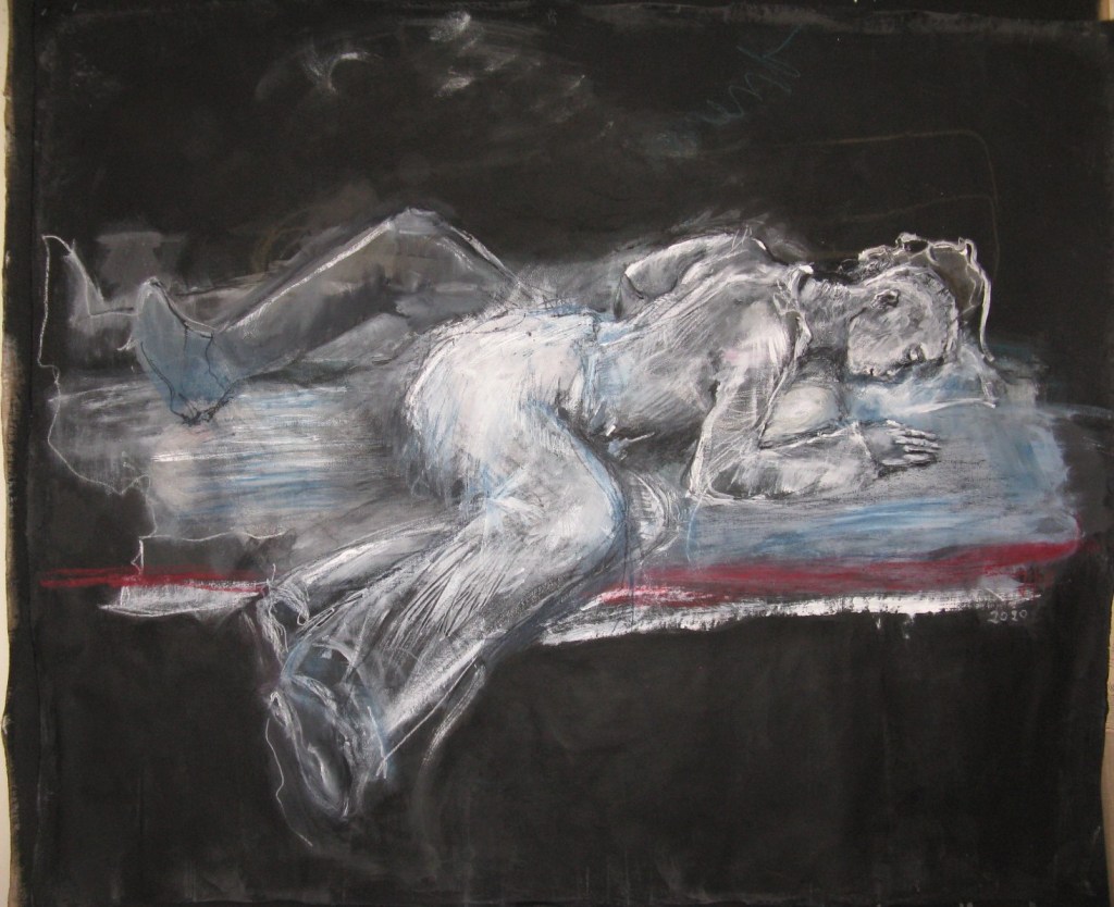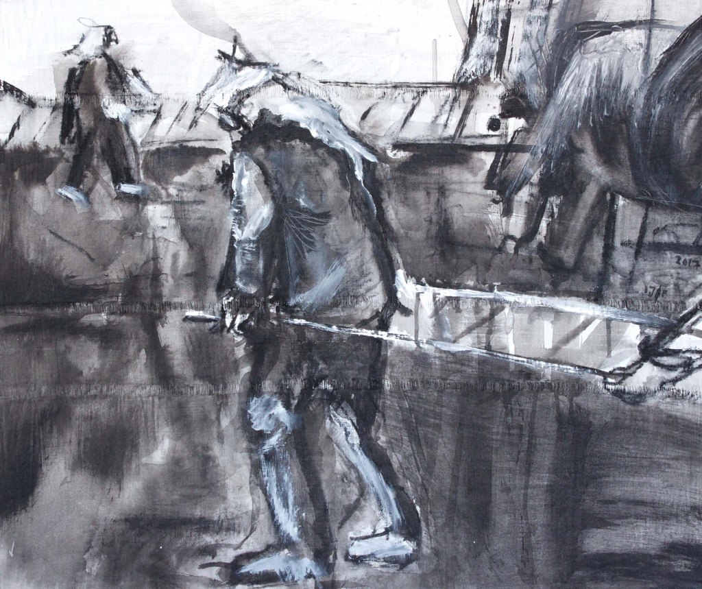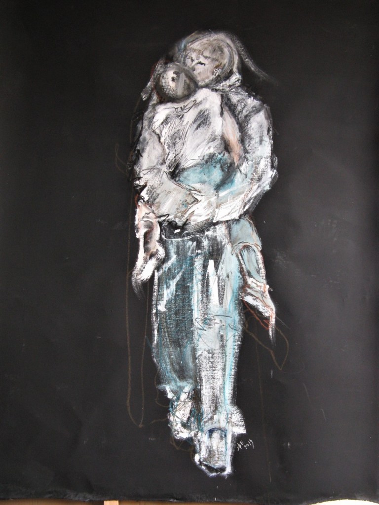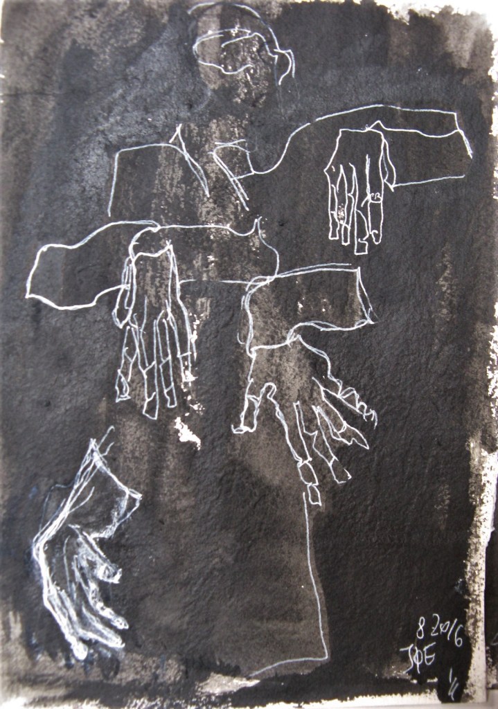 Le déclencheur de ce travail est une série d’images suscitées par la lecture de « La route « de Cormack Mc Carthy. Je vis clairement au cours de la lecture toutes ces personnes et ces lieux teintés exclusivement de gris et de noir. L écriture très simple en apparence de Cormack Mac Carthy traduit en mots sobres les situations vécues par l’homme et son enfant dans un monde dévasté, mais cette écriture simple en apparence suscita en moi des tas d’images, resurgissant épisodiquement par la suite.