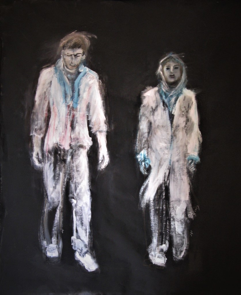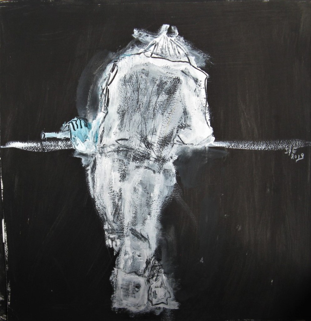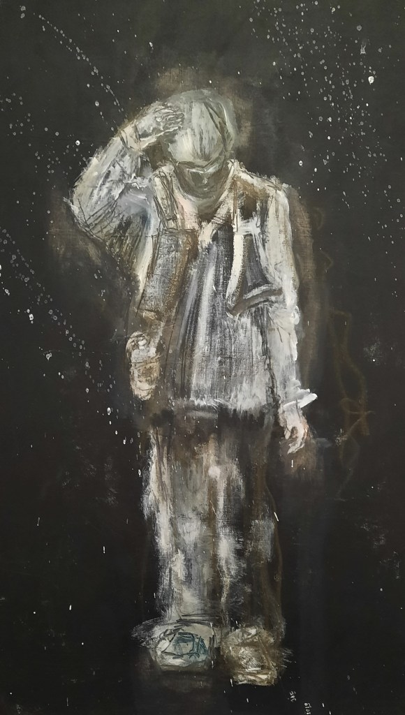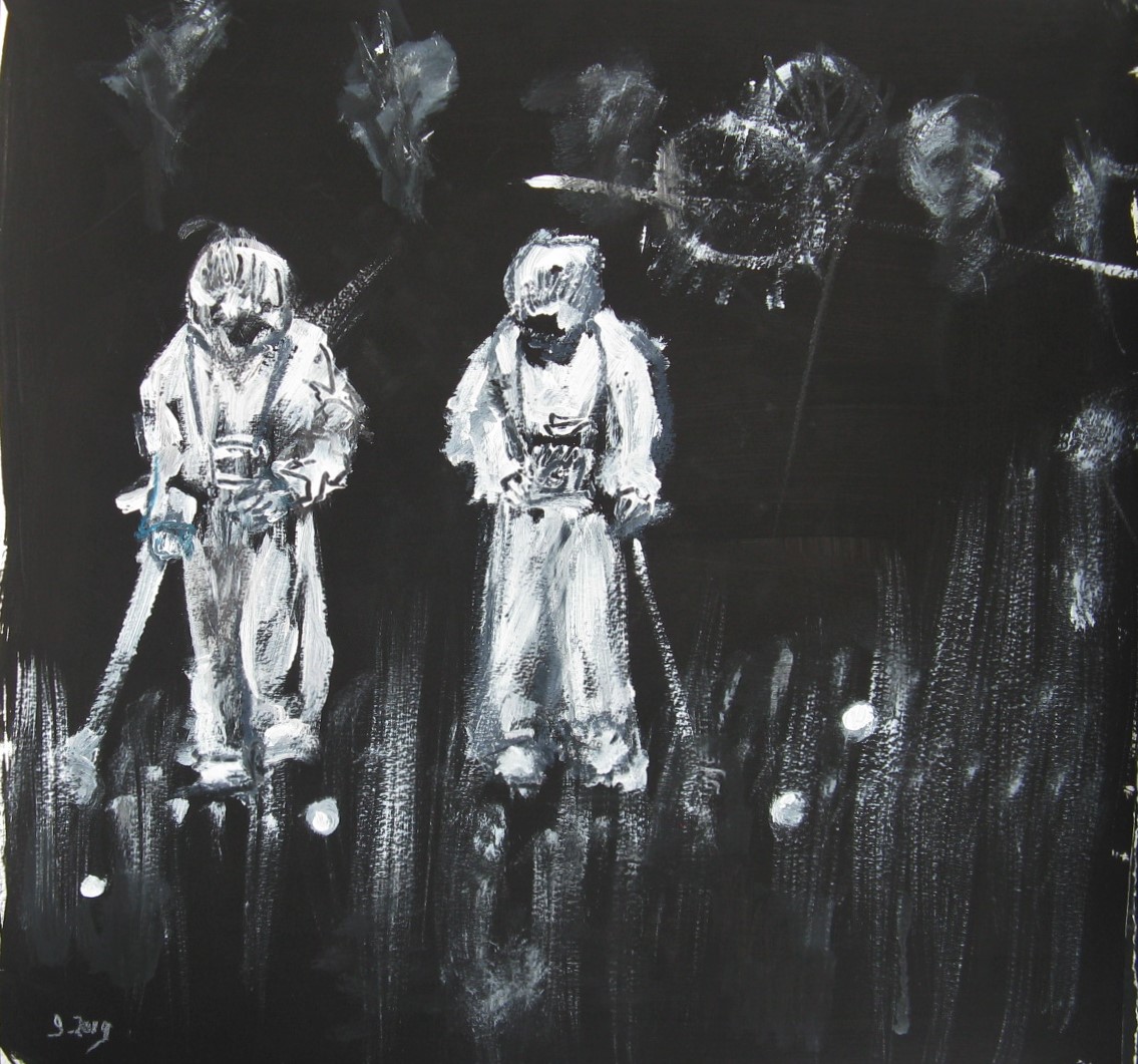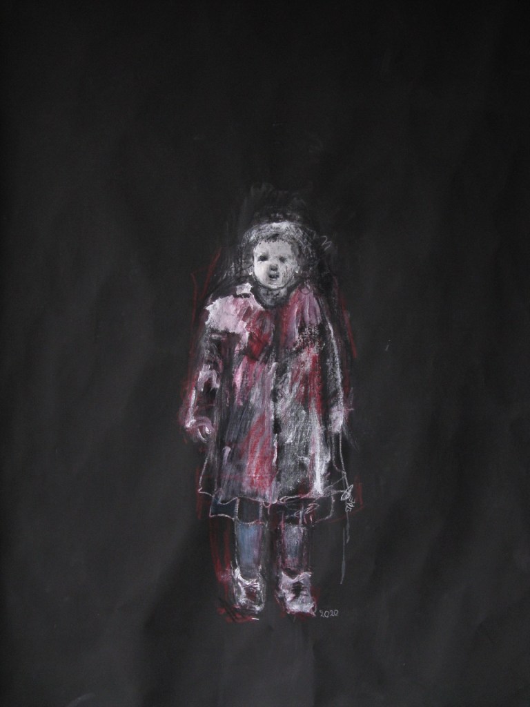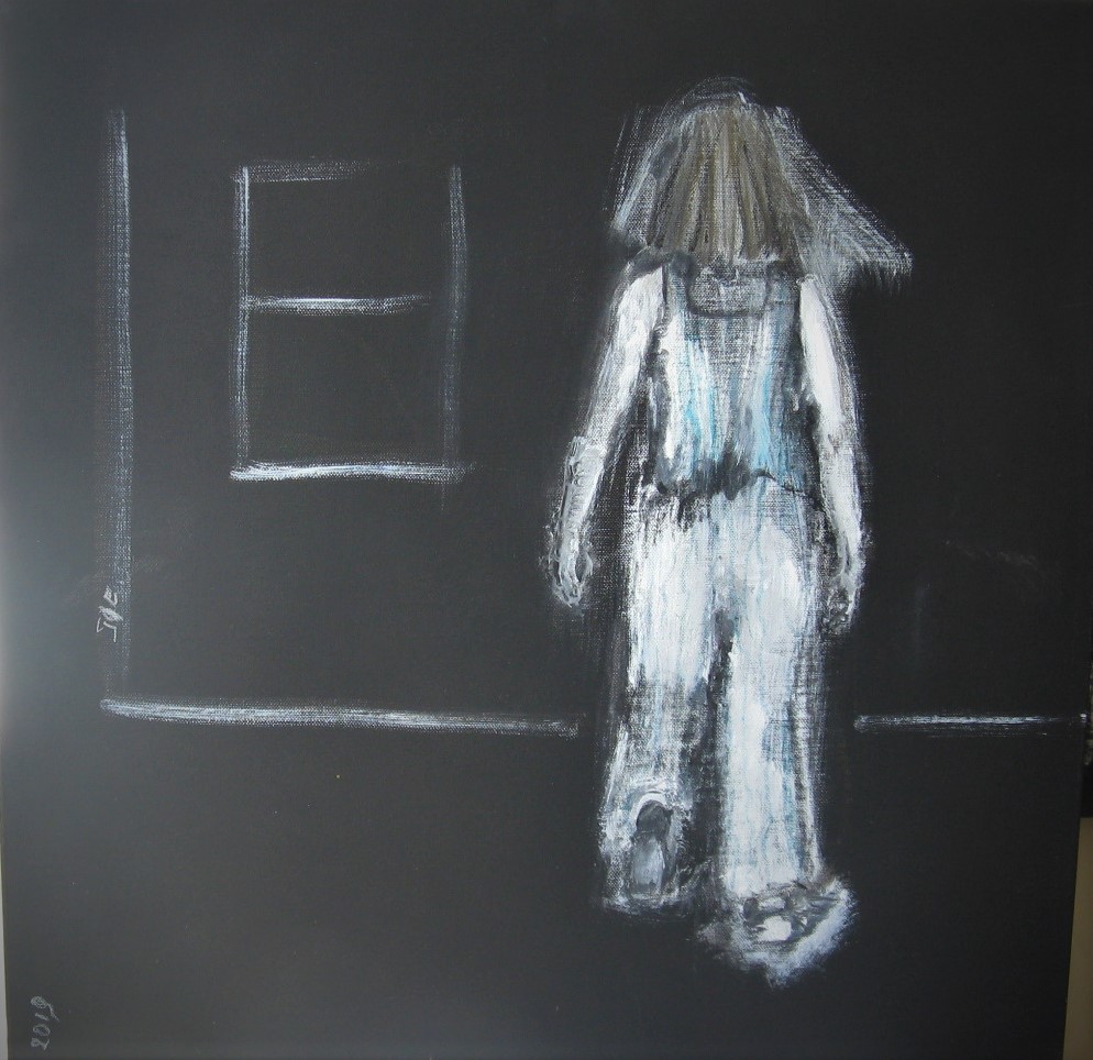 Il me fallait parler d’eux et d’elles. D’un point de vue pictural, cette série s’inscrit dans une recherche sur fond noir » Oeuvres au noir » ( voir plus loin) produite alors essentiellement sur papier 50×50 et entamée début 2019.