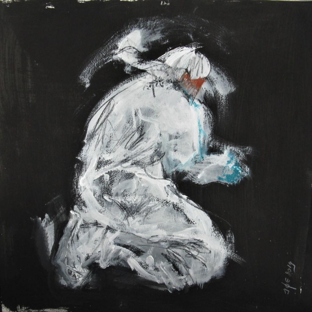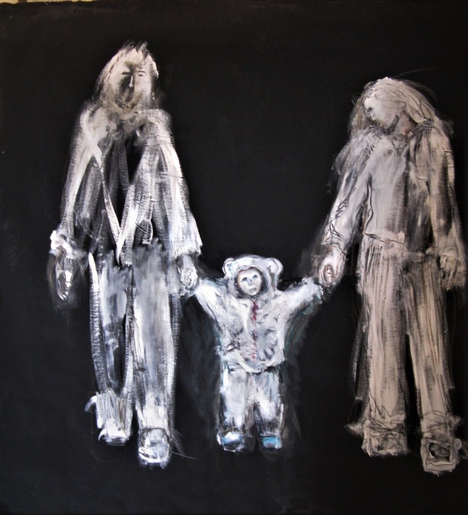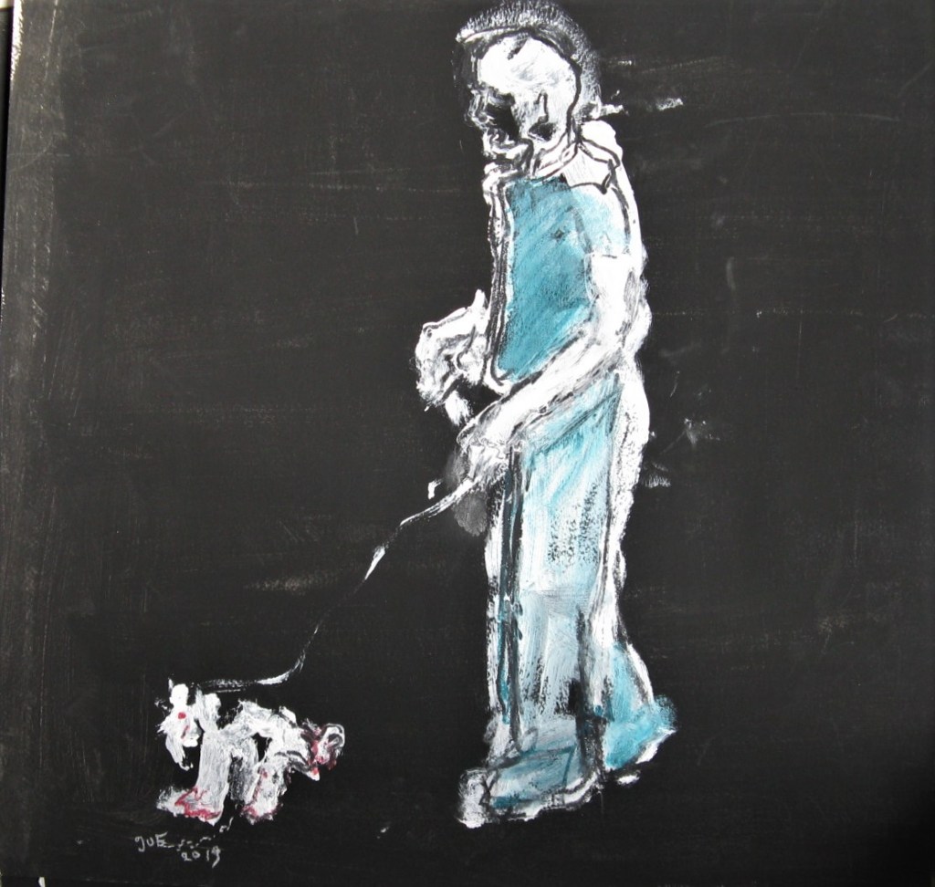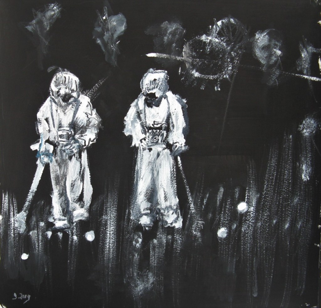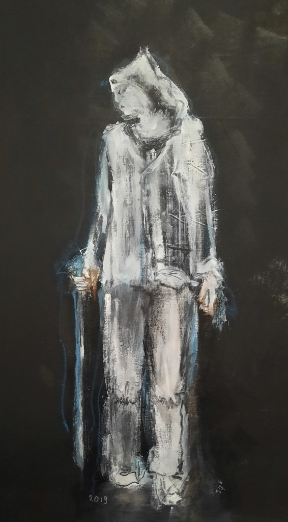 Il me fallait parler d’eux et d’elles. D’un point de vue pictural, cette série s’inscrit dans une recherche sur fond noir » Oeuvres au noir » ( voir plus loin) produite alors essentiellement sur papier 50×50 et entamée début 2019.