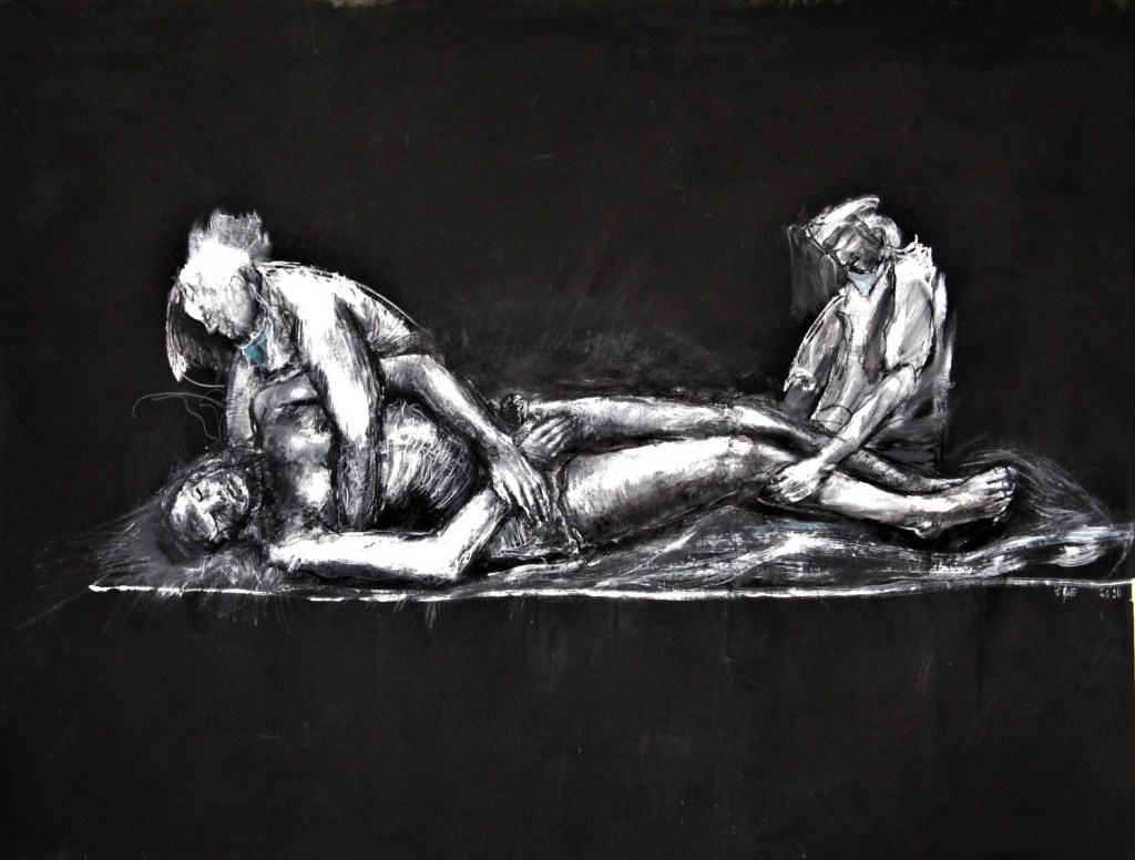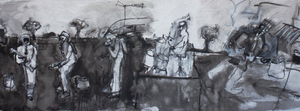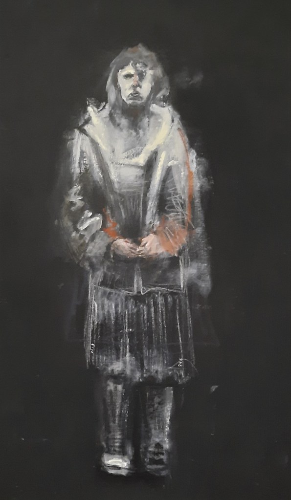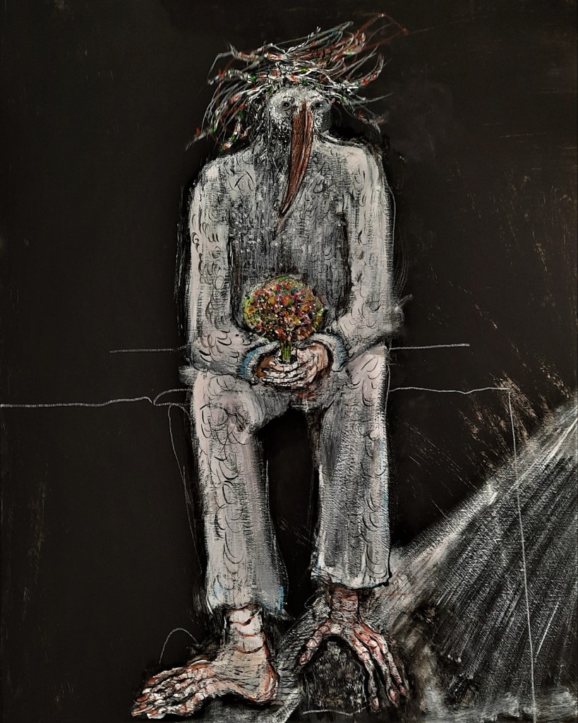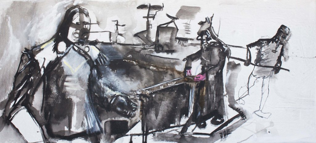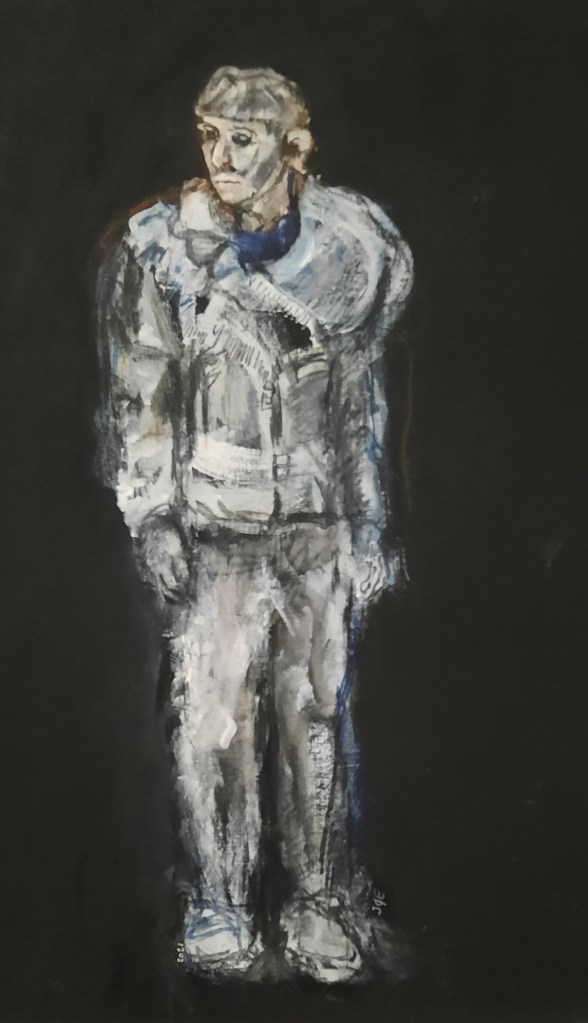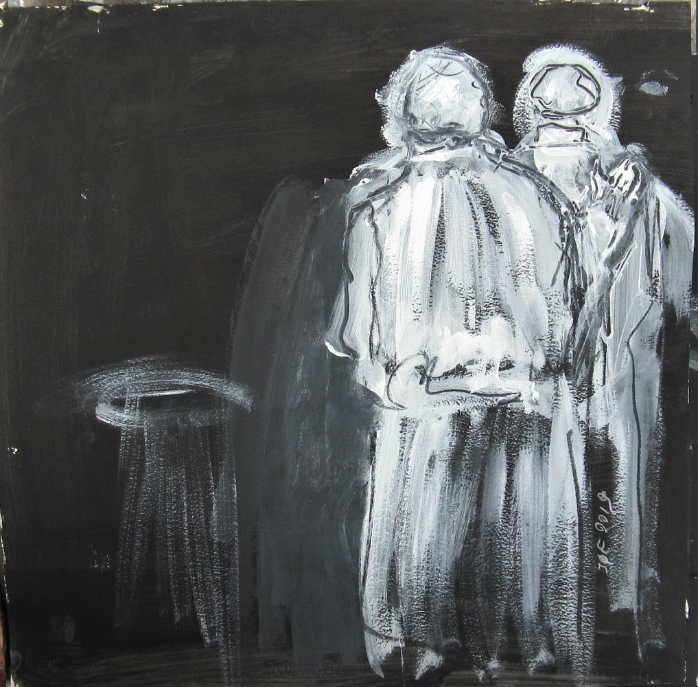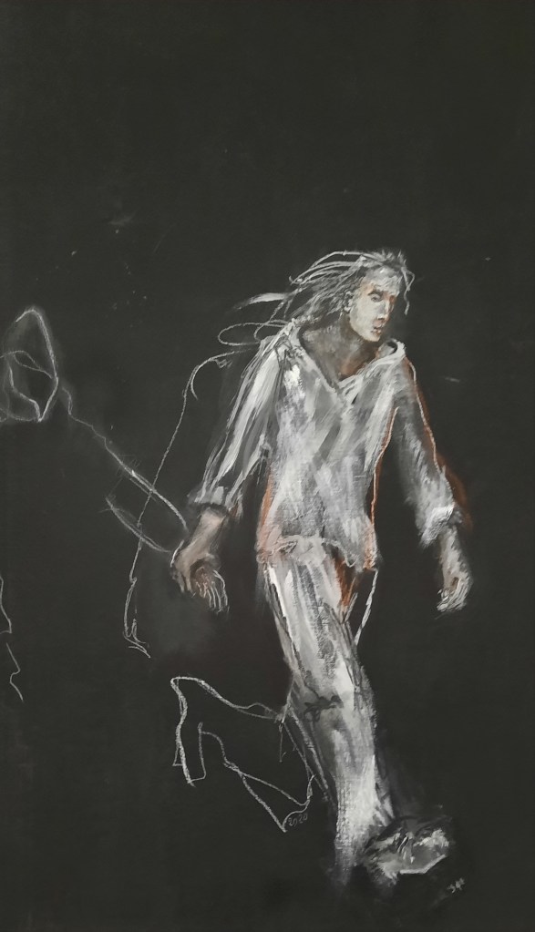 Il me fallait parler d’eux et d’elles. D’un point de vue pictural, cette série s’inscrit dans une recherche sur fond noir » Oeuvres au noir » ( voir plus loin) produite alors essentiellement sur papier 50×50 et entamée début 2019.