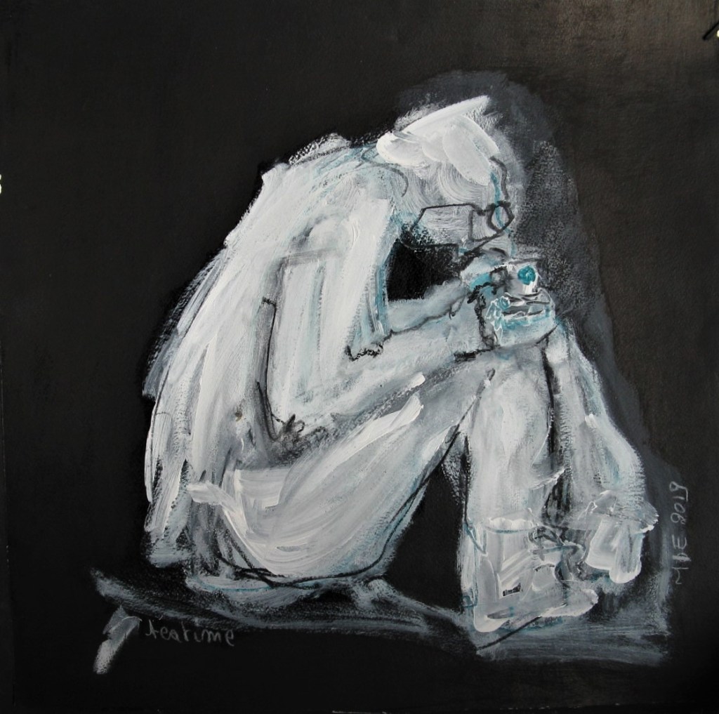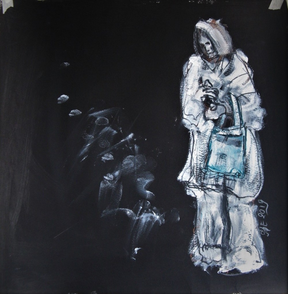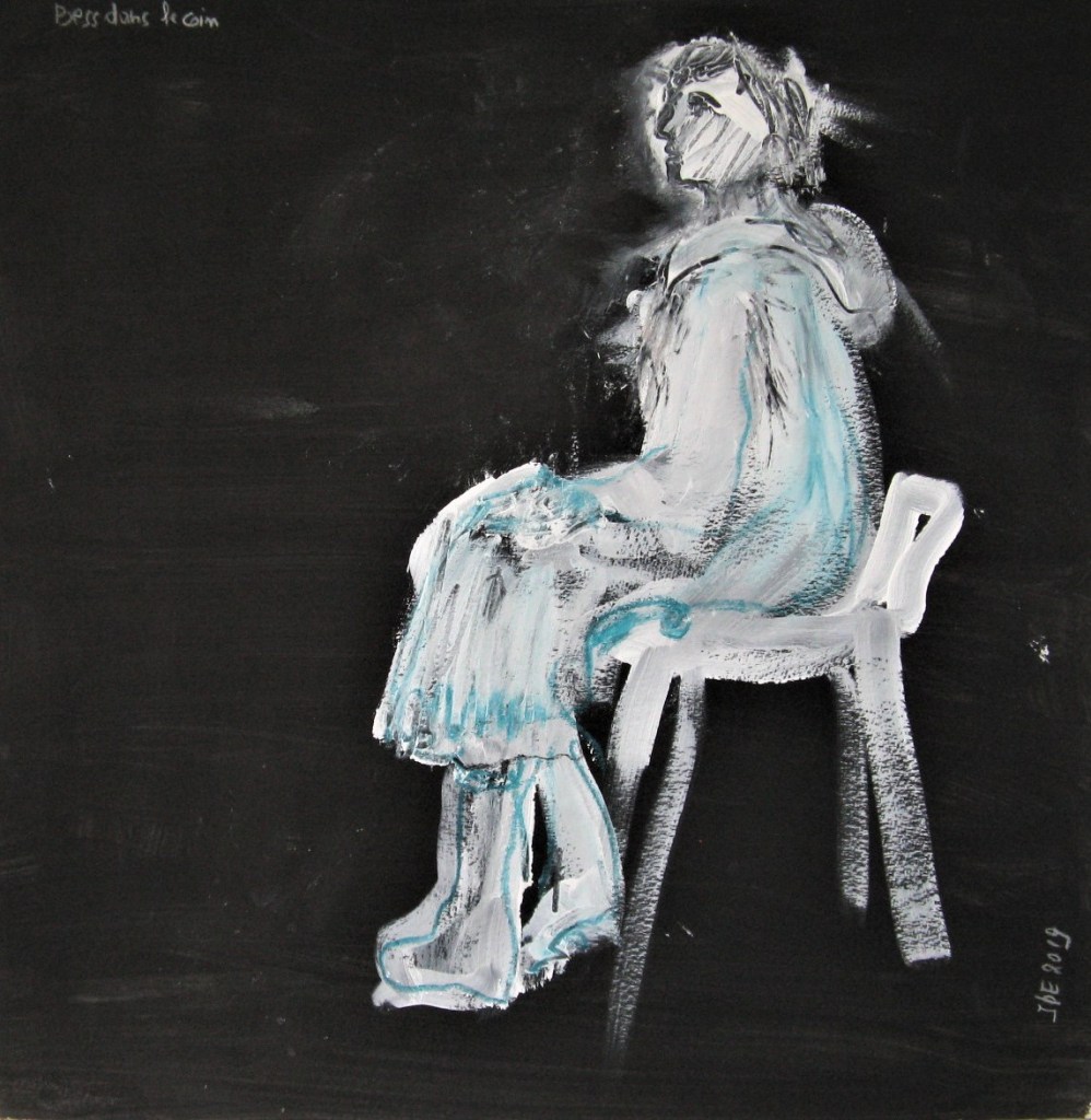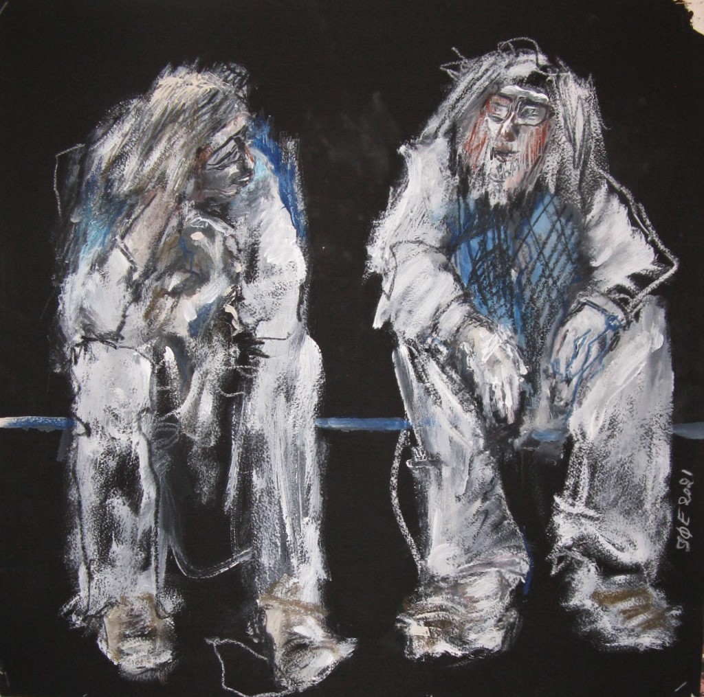 Le thème se situe en parallèle et consécutivement à la série » La route ». Un fond noir, et des personnes assises. Le format est le plus souvent 50×50 et le support le papier.