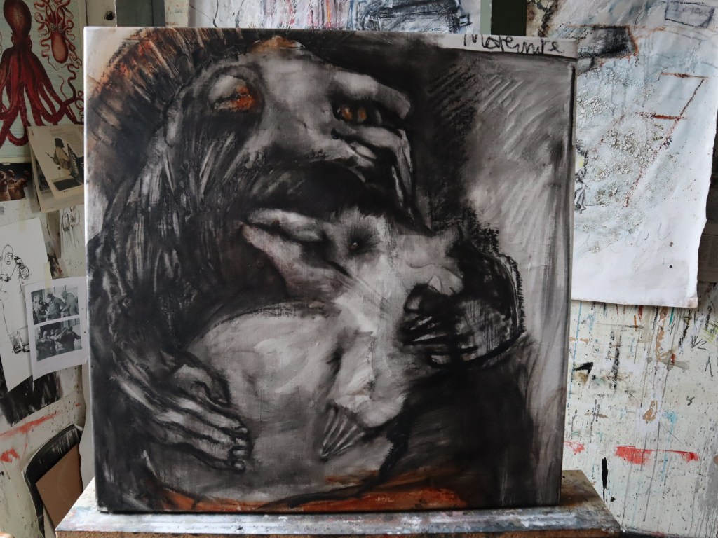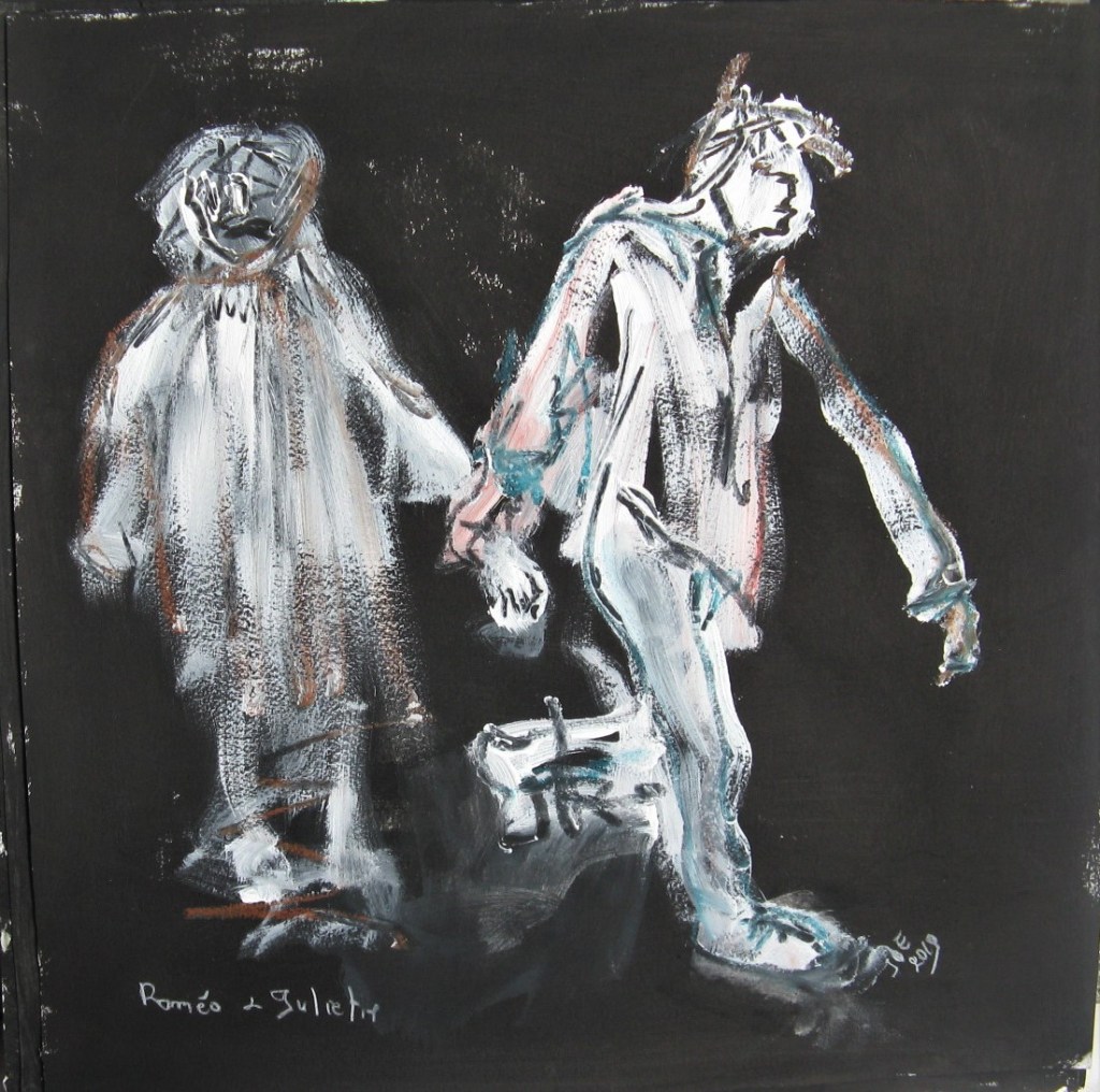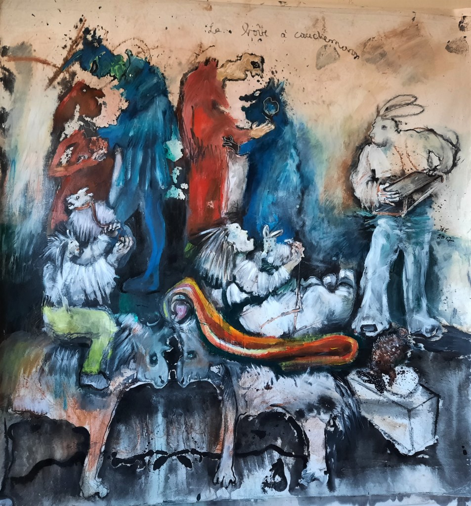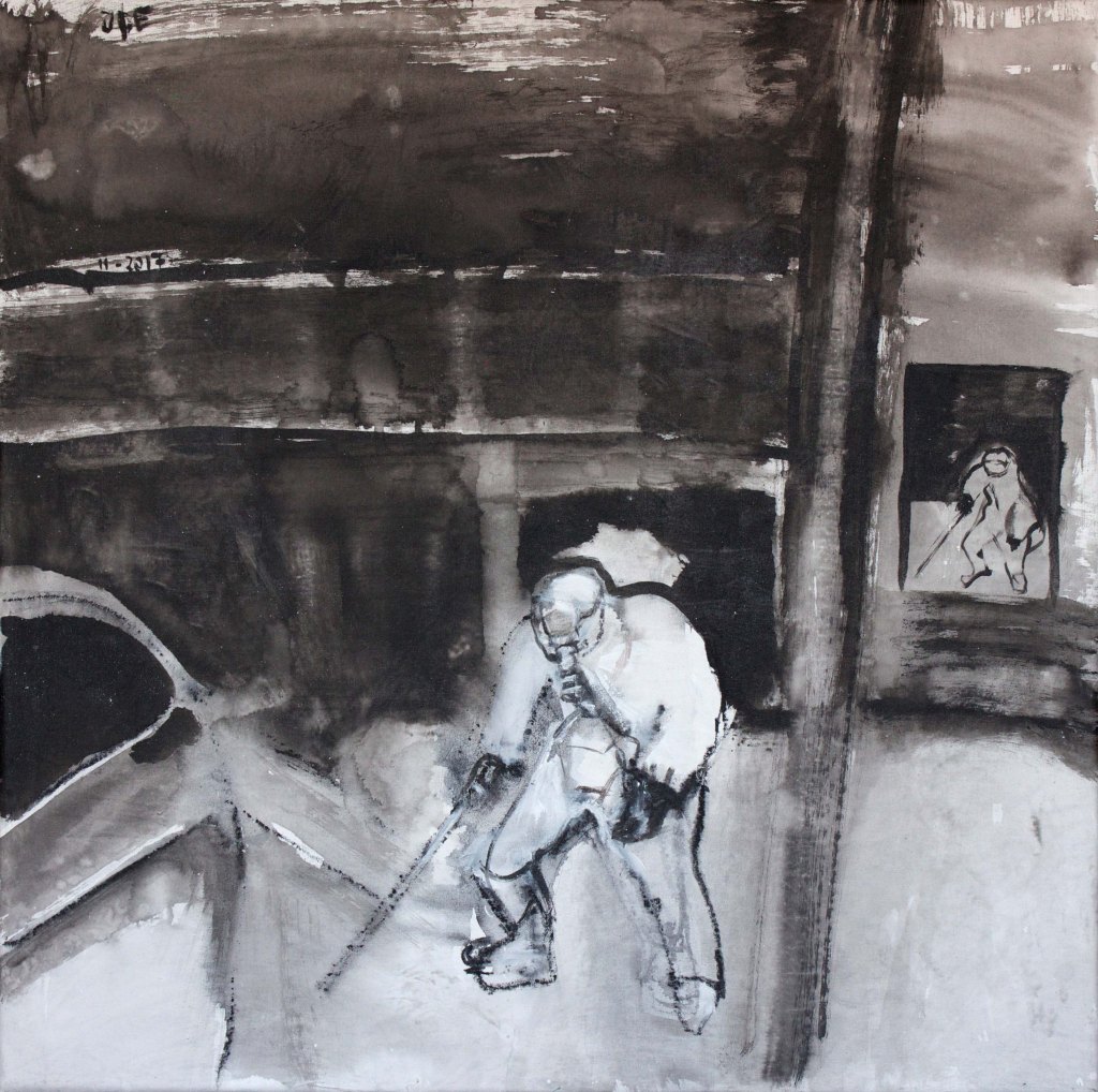En 2020, « Oeuvre au noir » 50×50 de la toile » Jeux d’hiver » ( Contes de Kostine »)de 2017- 68×72 cm