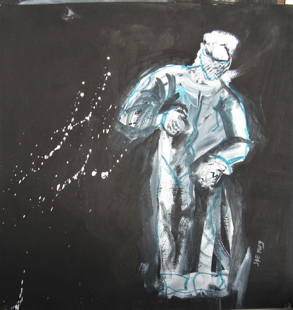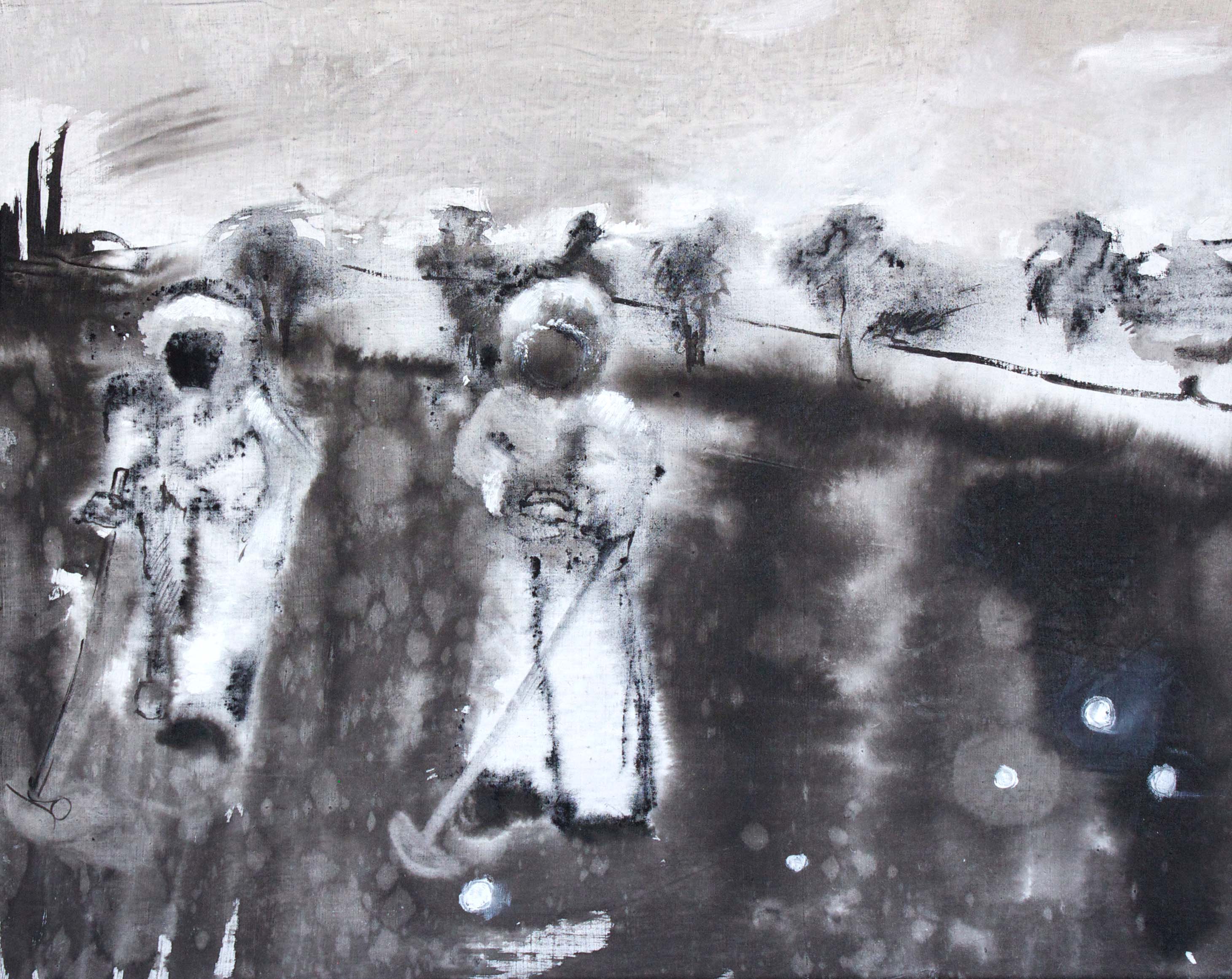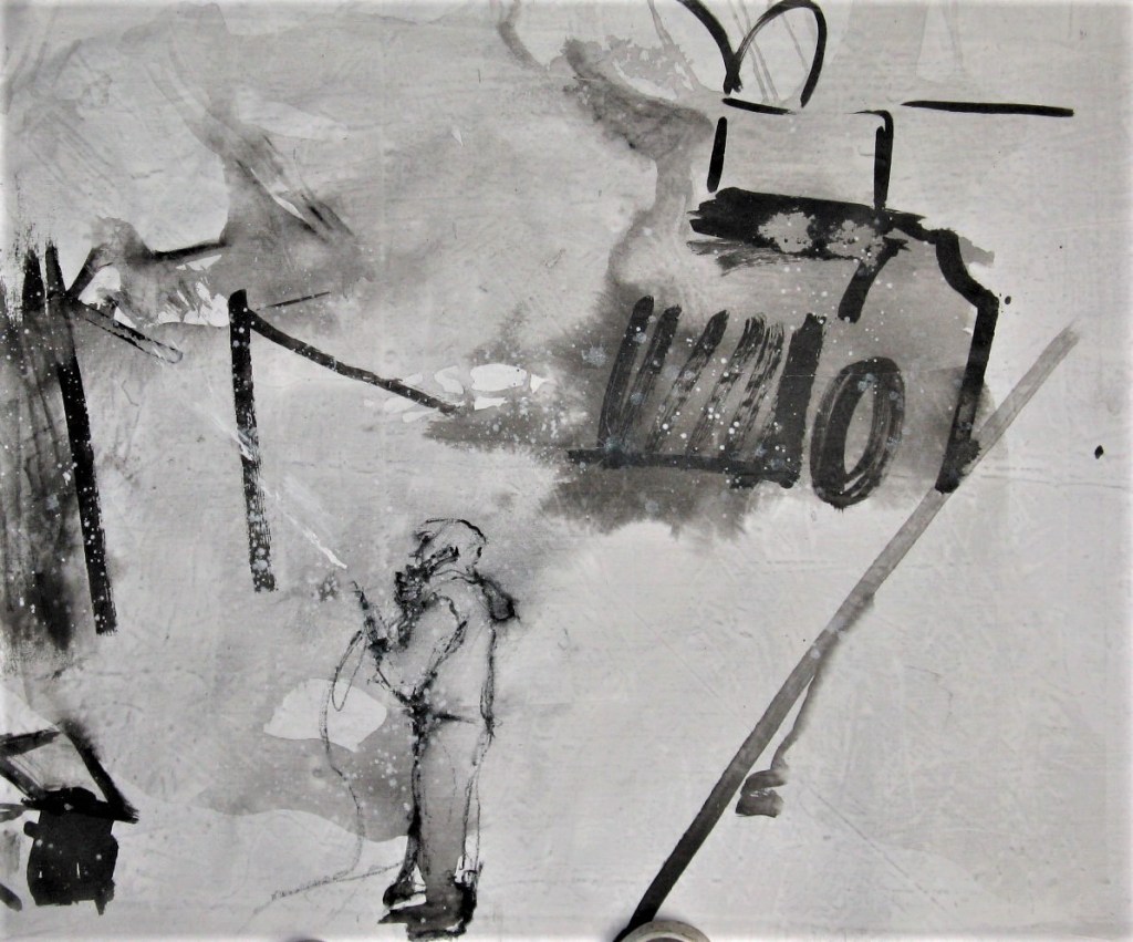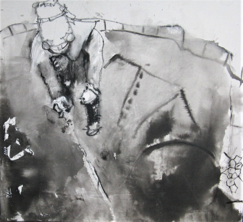 En 2020, « Oeuvre au noir » 50×50 de la toile » Jeux d’hiver » ( Contes de Kostine »)de 2017- 68×72 cm