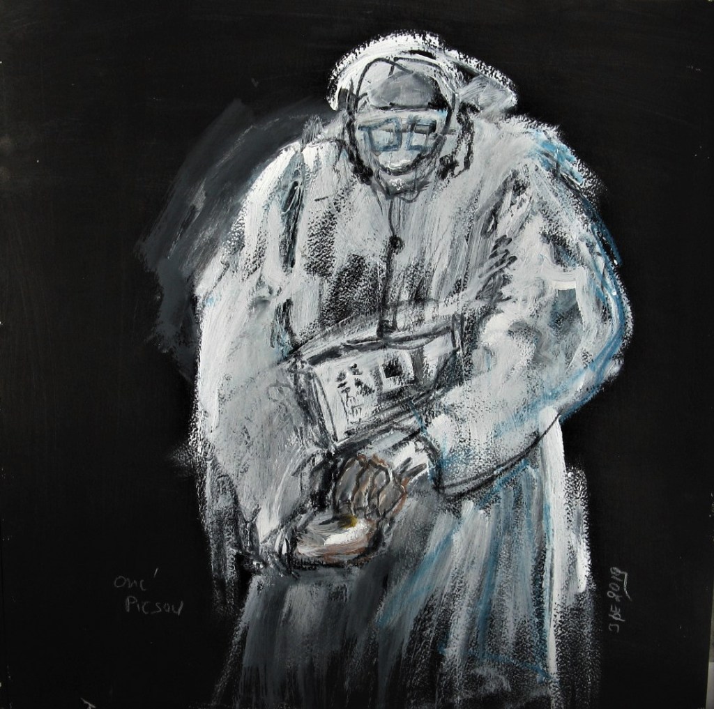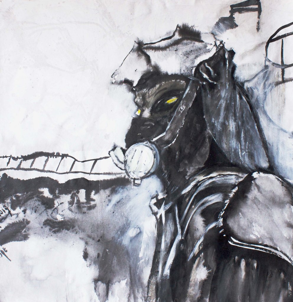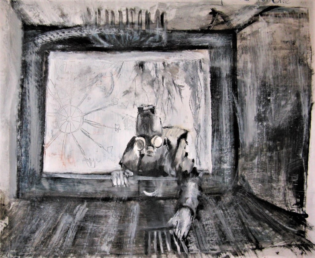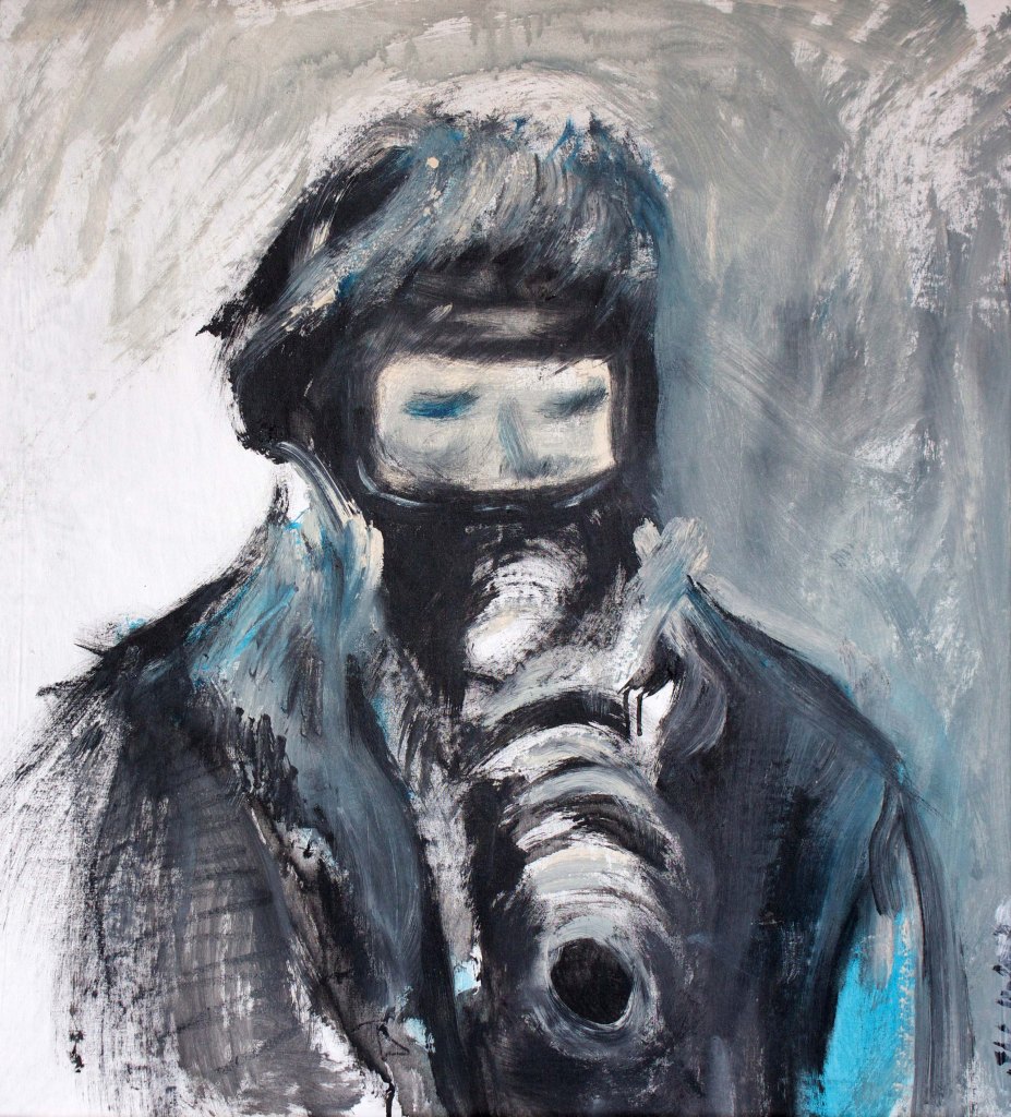 Cette série de peintures, principalement exécutées au crayon, à l’encre et à l’acrylique, et de format moyen, est inspirée des photos du reporter Igor Kostine dans « Confessions d’un reporter ». Une série de photos prises sur le site après la catastrophe nucléaire de Tchernobyl en 1986. Les photos, atteintes par les radiations donnent au tirage des images déjà piquetées, atteintes déjà dans leur nature même. Elles « content » ces personnes envoyées au front nucléaire, pour « nettoyer » le site.Derrière tous ces masques il y a des personnes anonymes qui à travers le témoignage de I.Kostine, racontent l’événement. Ce sont des contes, qui n’ont rien de féérique, certes mais qui furent pour moi une source d’inspiration de 2017 à 2018, tant par le sujet que par la qualité et la « matière » des images. Les titres donnés à la toile, ou l’ ajout d’un élément transforment et ouvrent la vision de l’image