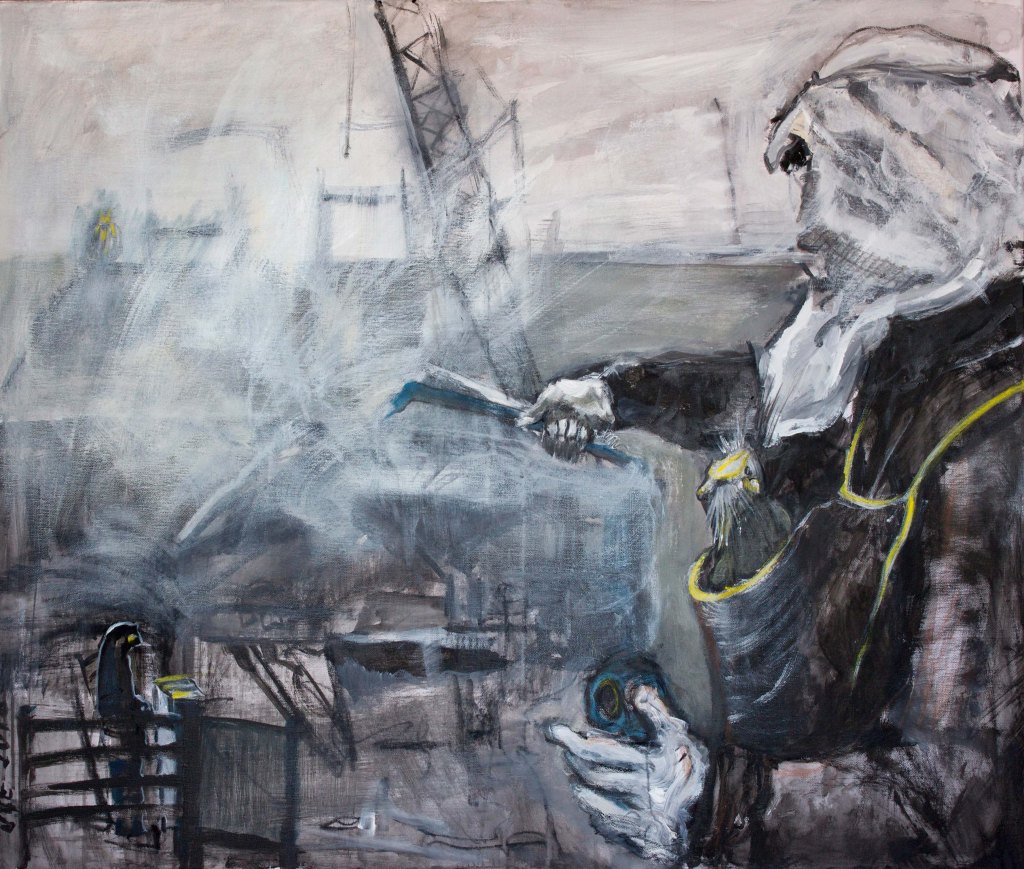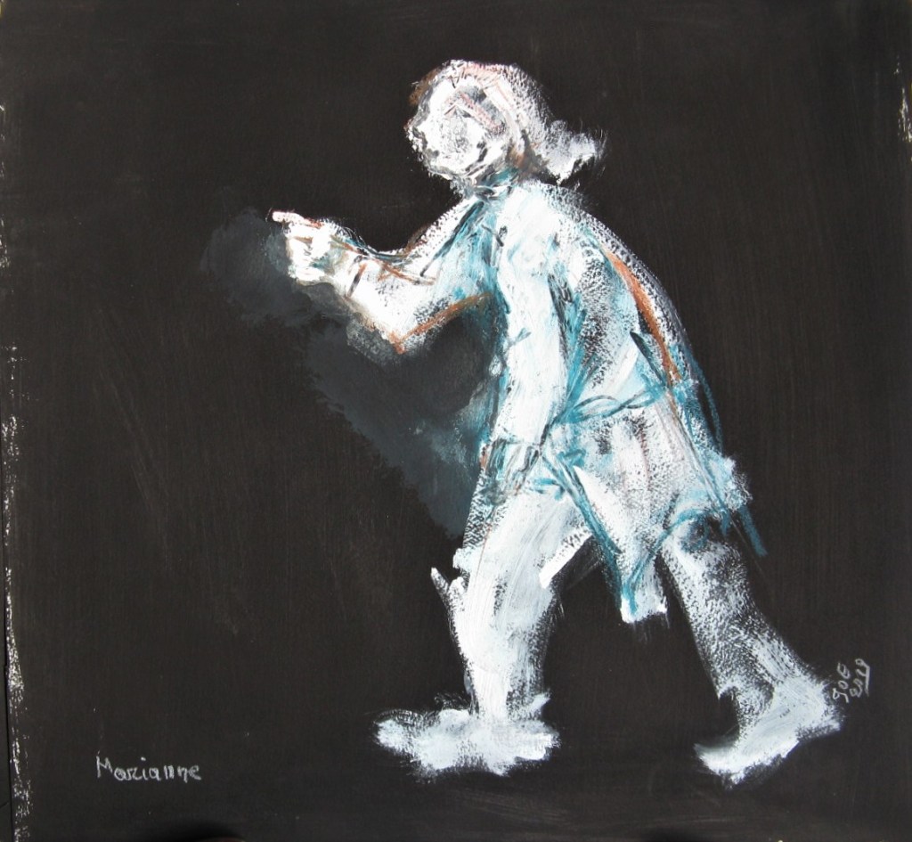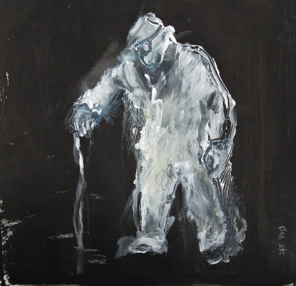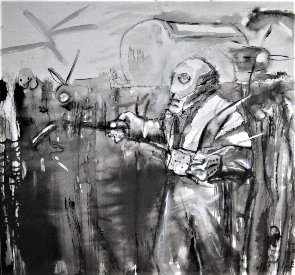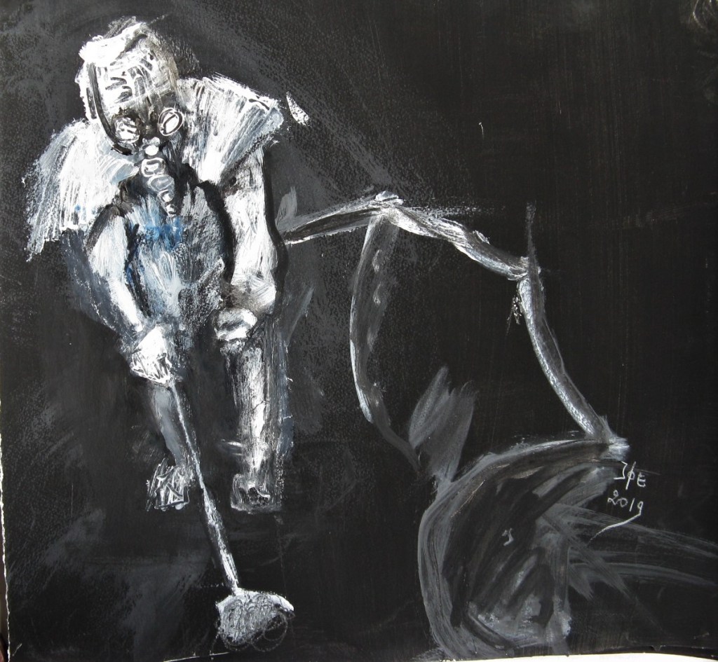 Cette série de peintures, principalement exécutées au crayon, à l’encre et à l’acrylique, et de format moyen, est inspirée des photos du reporter Igor Kostine dans « Confessions d’un reporter ». Une série de photos prises sur le site après la catastrophe nucléaire de Tchernobyl en 1986. Les photos, atteintes par les radiations donnent au tirage des images déjà piquetées, atteintes déjà dans leur nature même. Elles « content » ces personnes envoyées au front nucléaire, pour « nettoyer » le site.Derrière tous ces masques il y a des personnes anonymes qui à travers le témoignage de I.Kostine, racontent l’événement. Ce sont des contes, qui n’ont rien de féérique, certes mais qui furent pour moi une source d’inspiration de 2017 à 2018, tant par le sujet que par la qualité et la « matière » des images. Les titres donnés à la toile, ou l’ ajout d’un élément transforment et ouvrent la vision de l’image