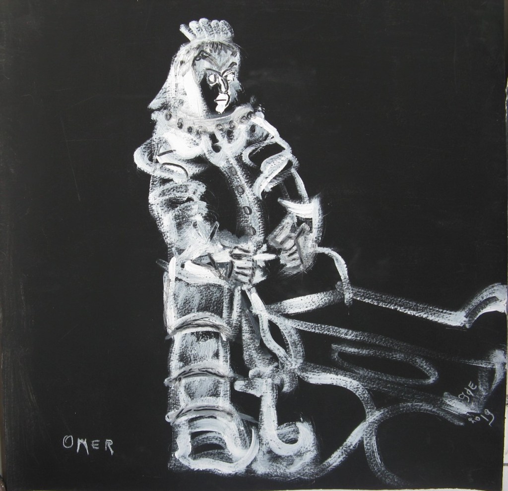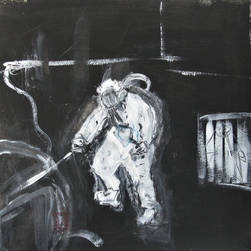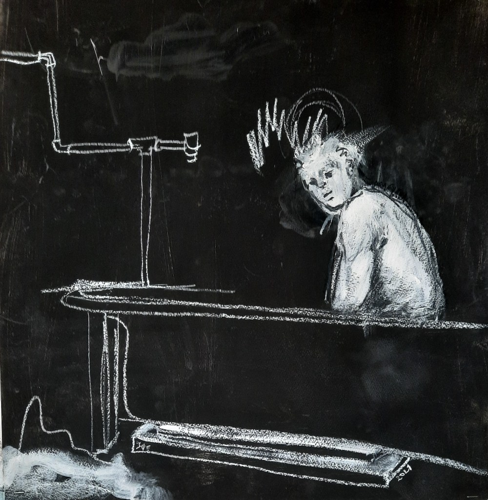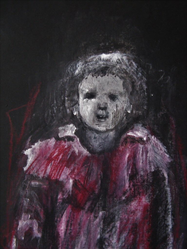 Cette série de peintures, principalement exécutées au crayon, à l’encre et à l’acrylique, et de format moyen, est inspirée des photos du reporter Igor Kostine dans « Confessions d’un reporter ». Une série de photos prises sur le site après la catastrophe nucléaire de Tchernobyl en 1986. Les photos, atteintes par les radiations donnent au tirage des images déjà piquetées, atteintes déjà dans leur nature même. Elles « content » ces personnes envoyées au front nucléaire, pour « nettoyer » le site.Derrière tous ces masques il y a des personnes anonymes qui à travers le témoignage de I.Kostine, racontent l’événement. Ce sont des contes, qui n’ont rien de féérique, certes mais qui furent pour moi une source d’inspiration de 2017 à 2018, tant par le sujet que par la qualité et la « matière » des images. Les titres donnés à la toile, ou l’ ajout d’un élément transforment et ouvrent la vision de l’image