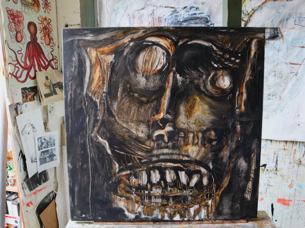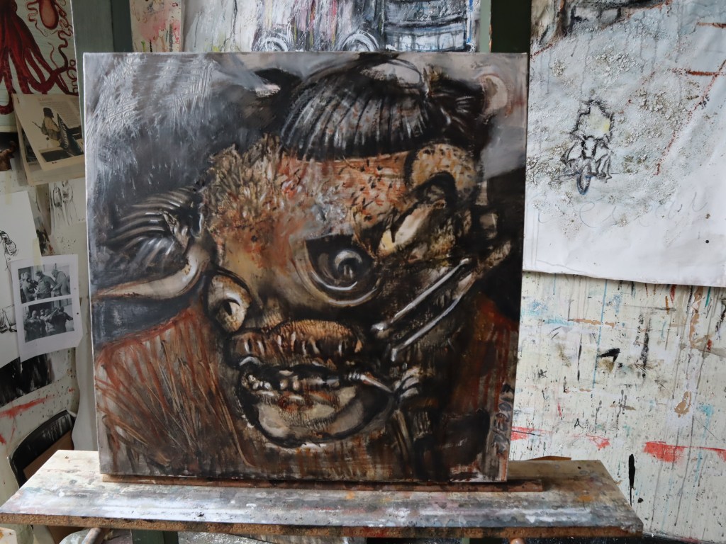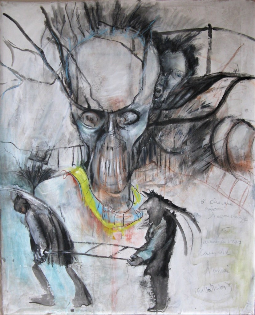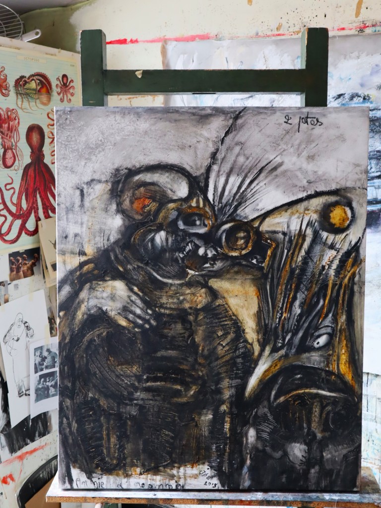 Depuis 2014 cette série de monstres qui émergent de la matière, des taches, des lignes, comme les images qui émergent du rideau de douche ou des rochers. Le bâton d’huile est le médium idéal pour cette recherche d’autres visages. Rechercher car traquer la « beauté cachée du laid ». J’ai choisi de les présenter dans leur contexte, mon atelier.