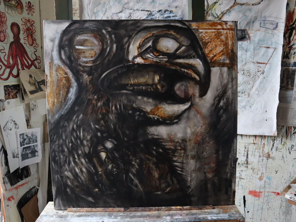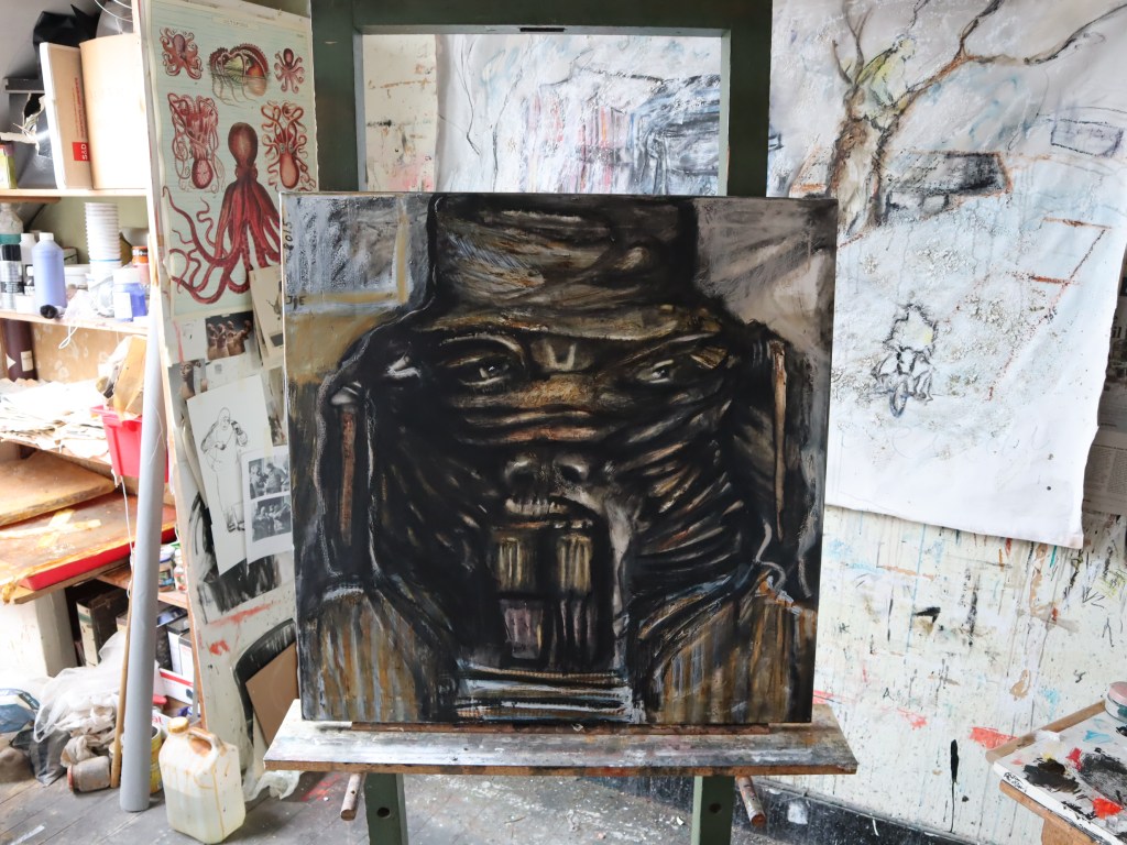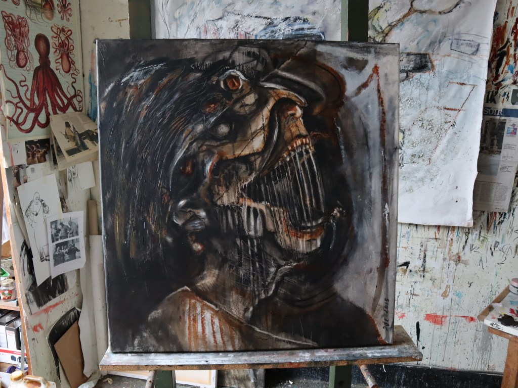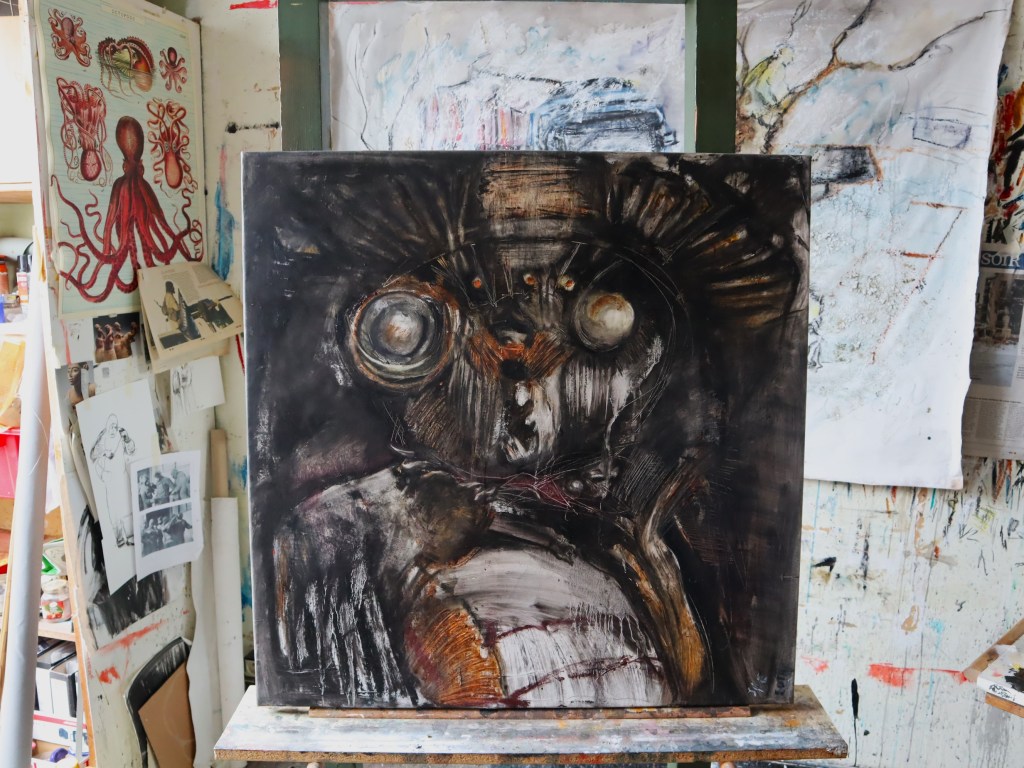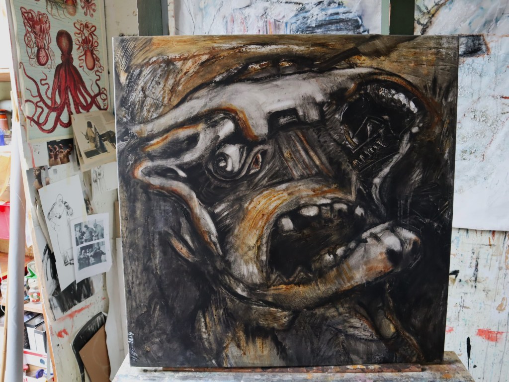 Depuis 2014 cette série de monstres qui émergent de la matière, des taches, des lignes, comme les images qui émergent du rideau de douche ou des rochers. Le bâton d’huile est le médium idéal pour cette recherche d’autres visages. Rechercher car traquer la « beauté cachée du laid ». J’ai choisi de les présenter dans leur contexte, mon atelier.