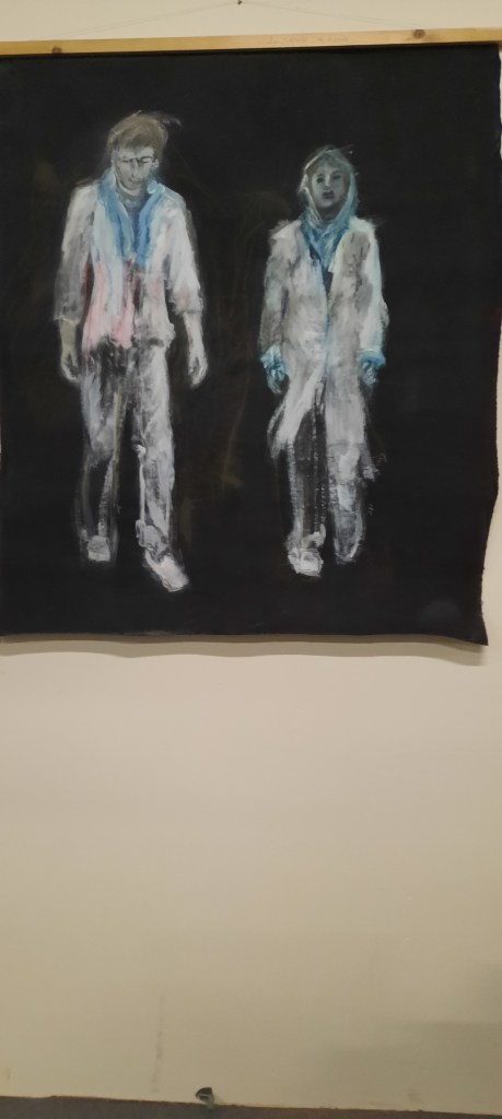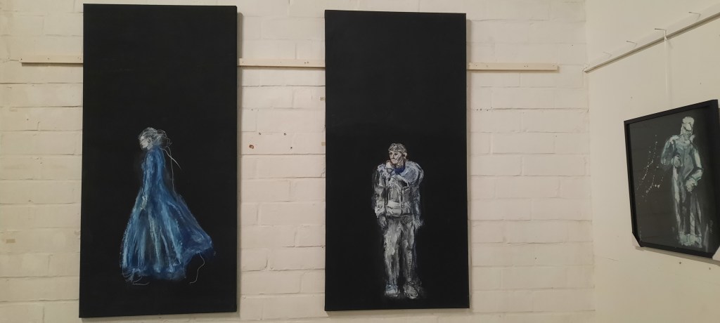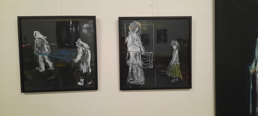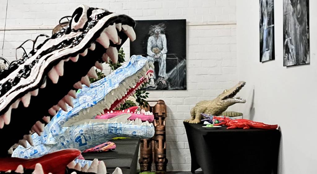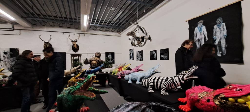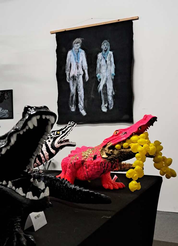 - Exposition au Centre d’art fantastique– 18- rue de la Glacière à St-gilles les week-ends des 3/4, 10/11 et 17/18 décembre « De l’autre côté de la ville » https://www.quefaire.be/de-autre-cote-de-la-ville-8480031.shtml?utm_source=fbr_nat2&utm_medium=web&utm_campaign=facebookfp https://www.facebook.com/quefaire.be/posts/587152643417761. Ma participation et un 1er prix obtenu au concours d’ Art Fantastique , le BIFF Art Contest dans le cadre du Festival du cinéma fantastique au Heyzel début septembre, m’a ouvert les portes du Centre d’ Art Fantastique. Un lieu où exposer. Un lieu spacieux et de forme carrée dans lequel je devais faire cohabiter mon travail avec des crocodiles, sculptures de polyester peintes et retravaillées par divers artistes. Crocos colorés, ouvrant tout grand leurs mâchoires en direction de mes personnages marchant ou se reposant dans le noir, dans la nuit qui les enveloppe comme un cocon. C’est « De l’autre côté de la ville » que se croisent ces animaux sortis des égoûts selon les légendes urbaines, et ces personnes suivant des routes de migrations millénaires. Pour moi la rencontre fut heureuse tant par rapport au Centre d’ Art Fantastique qu’en ce qui concerne le résultat visuel de cette rencontre.
