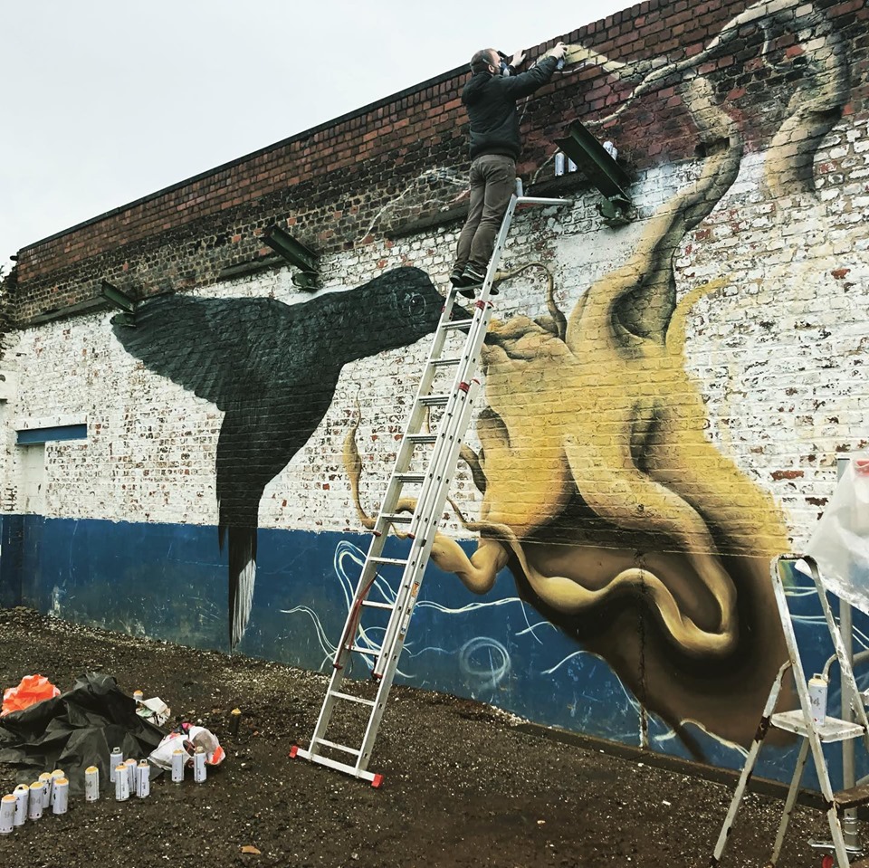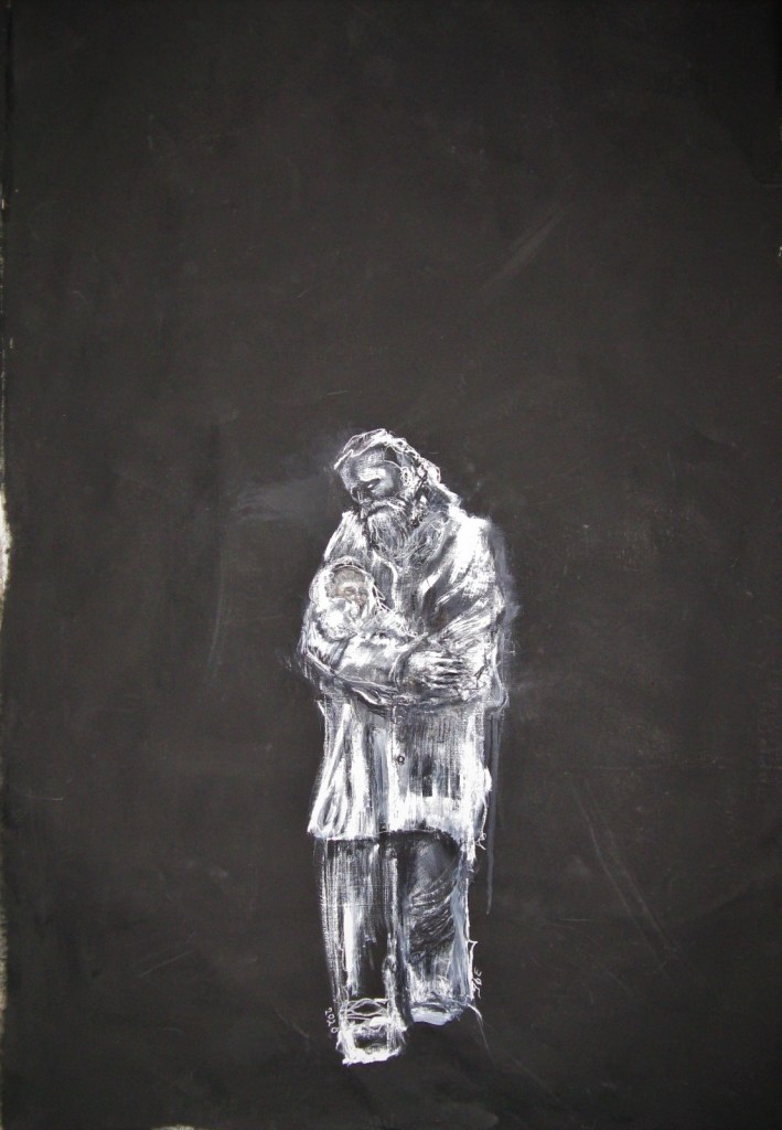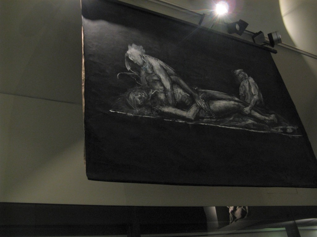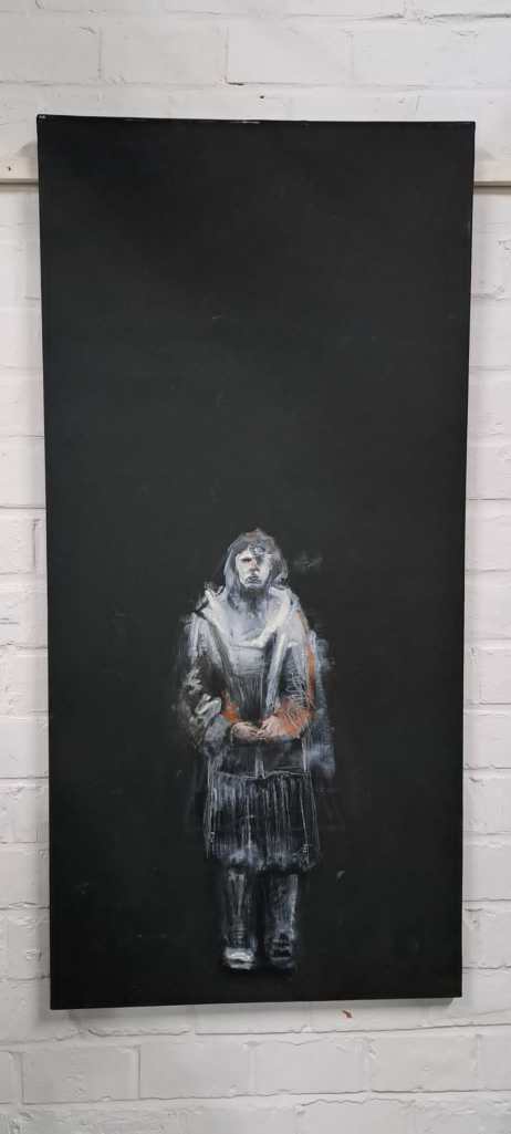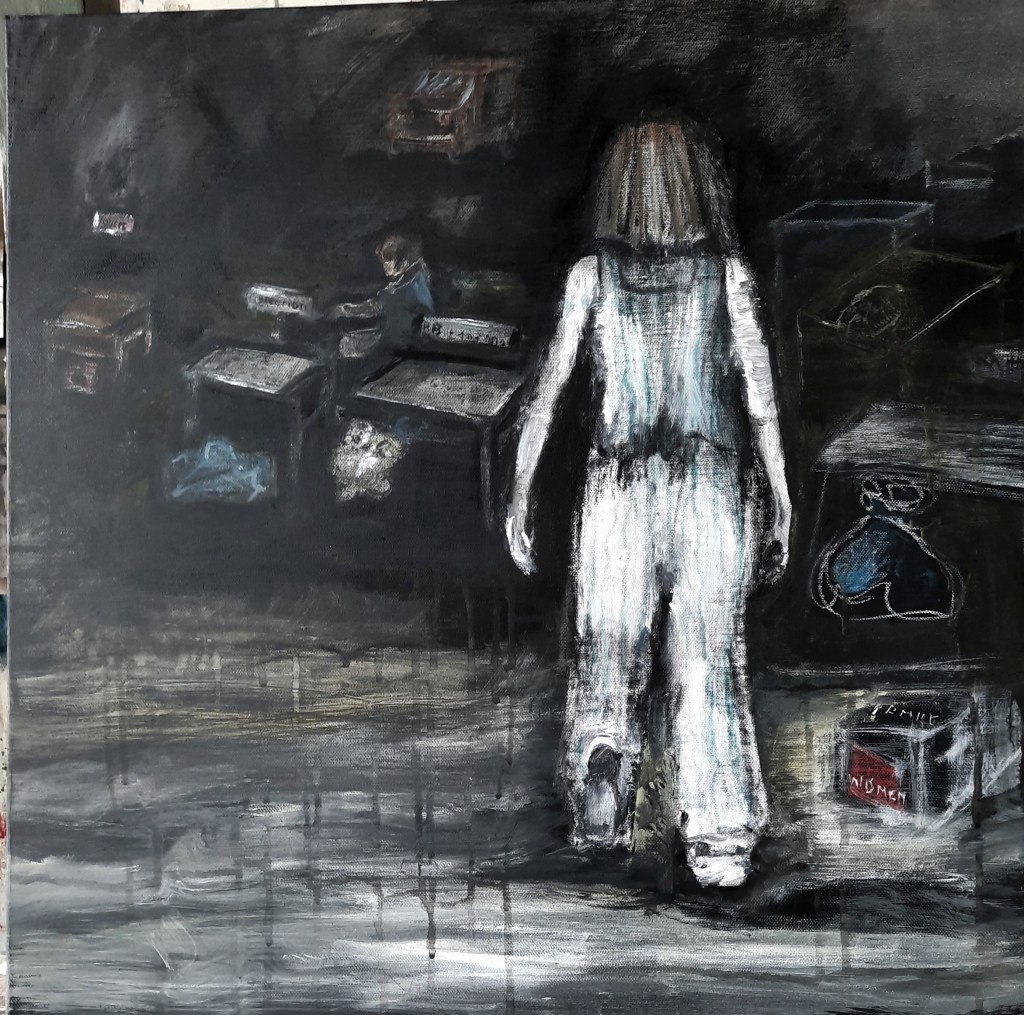 - Exposition au Centre d’art fantastique– 18- rue de la Glacière à St-gilles les week-ends des 3/4, 10/11 et 17/18 décembre « De l’autre côté de la ville » https://www.quefaire.be/de-autre-cote-de-la-ville-8480031.shtml?utm_source=fbr_nat2&utm_medium=web&utm_campaign=facebookfp https://www.facebook.com/quefaire.be/posts/587152643417761. Ma participation et un 1er prix obtenu au concours d’ Art Fantastique , le BIFF Art Contest dans le cadre du Festival du cinéma fantastique au Heyzel début septembre, m’a ouvert les portes du Centre d’ Art Fantastique. Un lieu où exposer. Un lieu spacieux et de forme carrée dans lequel je devais faire cohabiter mon travail avec des crocodiles, sculptures de polyester peintes et retravaillées par divers artistes. Crocos colorés, ouvrant tout grand leurs mâchoires en direction de mes personnages marchant ou se reposant dans le noir, dans la nuit qui les enveloppe comme un cocon. C’est « De l’autre côté de la ville » que se croisent ces animaux sortis des égoûts selon les légendes urbaines, et ces personnes suivant des routes de migrations millénaires. Pour moi la rencontre fut heureuse tant par rapport au Centre d’ Art Fantastique qu’en ce qui concerne le résultat visuel de cette rencontre.